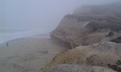 Heute ging die Weiterfahrt weiter auf der berühmten "Route 1" direkt an der Küste. Doch wo war denn die Küste? Von der Straße aus war es fast nicht möglich das Meer zu erkennen, denn der Nebel war sehr stark. So machten wir zweimal Halt an einem Parkplatz direkt am "Strand", wobei sich wahrscheinlich dort niemand ins Wasser traut, denn vor der Strömung wird gewarnt, und der Wellengang war enorm! Man konnte erkennen, dass es zur Zeit wohl Ebbe war, denn die Felsen waren ausgewaschen, und einzelne kleine Seen am Strand waren auch zu sehen, die von der Flut noch übrig waren.